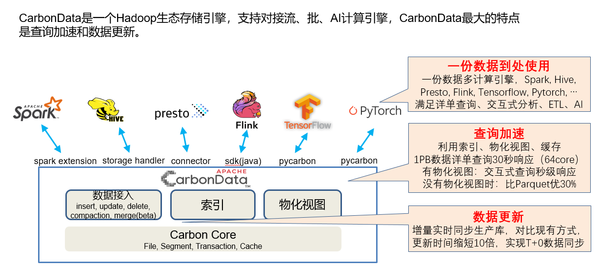 - 支持标准SQL语法做批量数据更新,删除,数据合并:CarbonData是HDFS分布式存储上首个支持数据更新和删除的数据存储,满足用户对融合数据进行有效管理的需求,避免其它类HDFS数据变化后,需要重新导入的Cost。