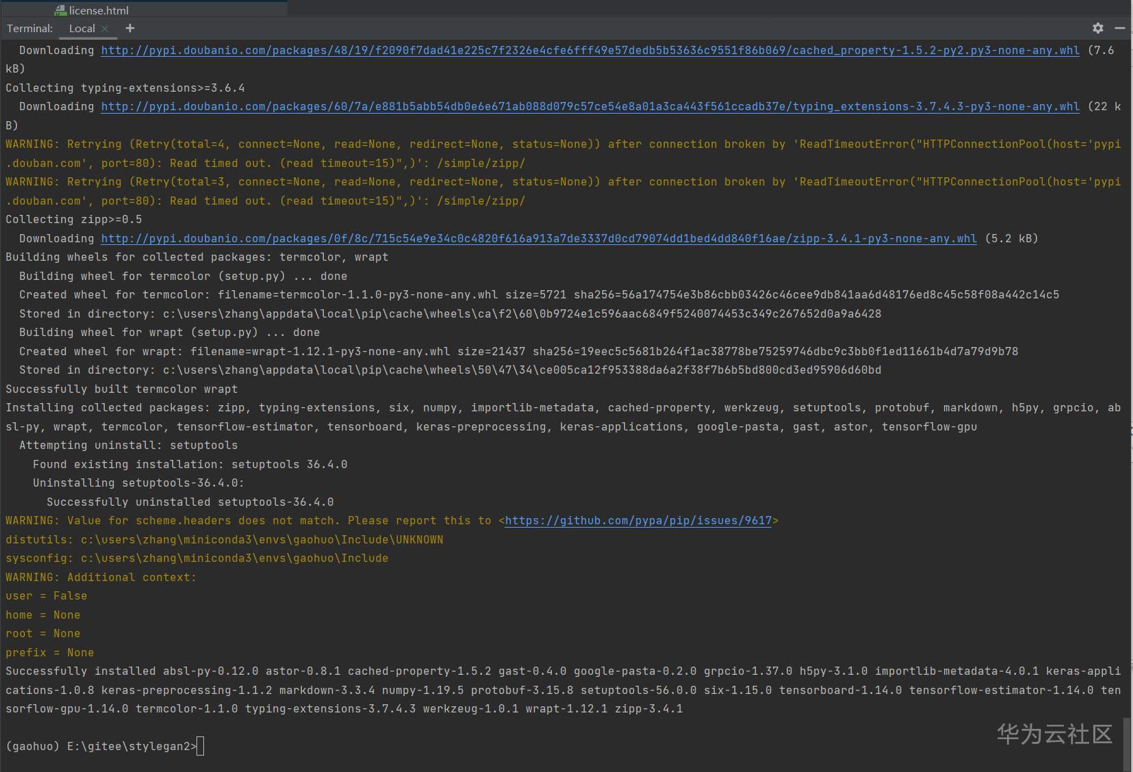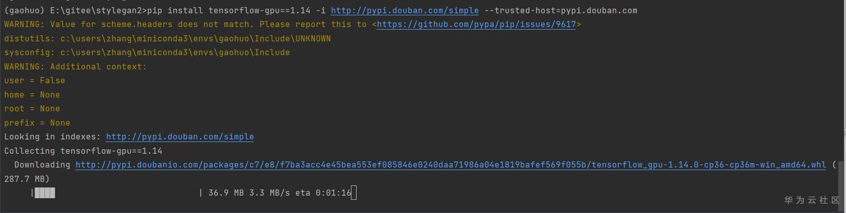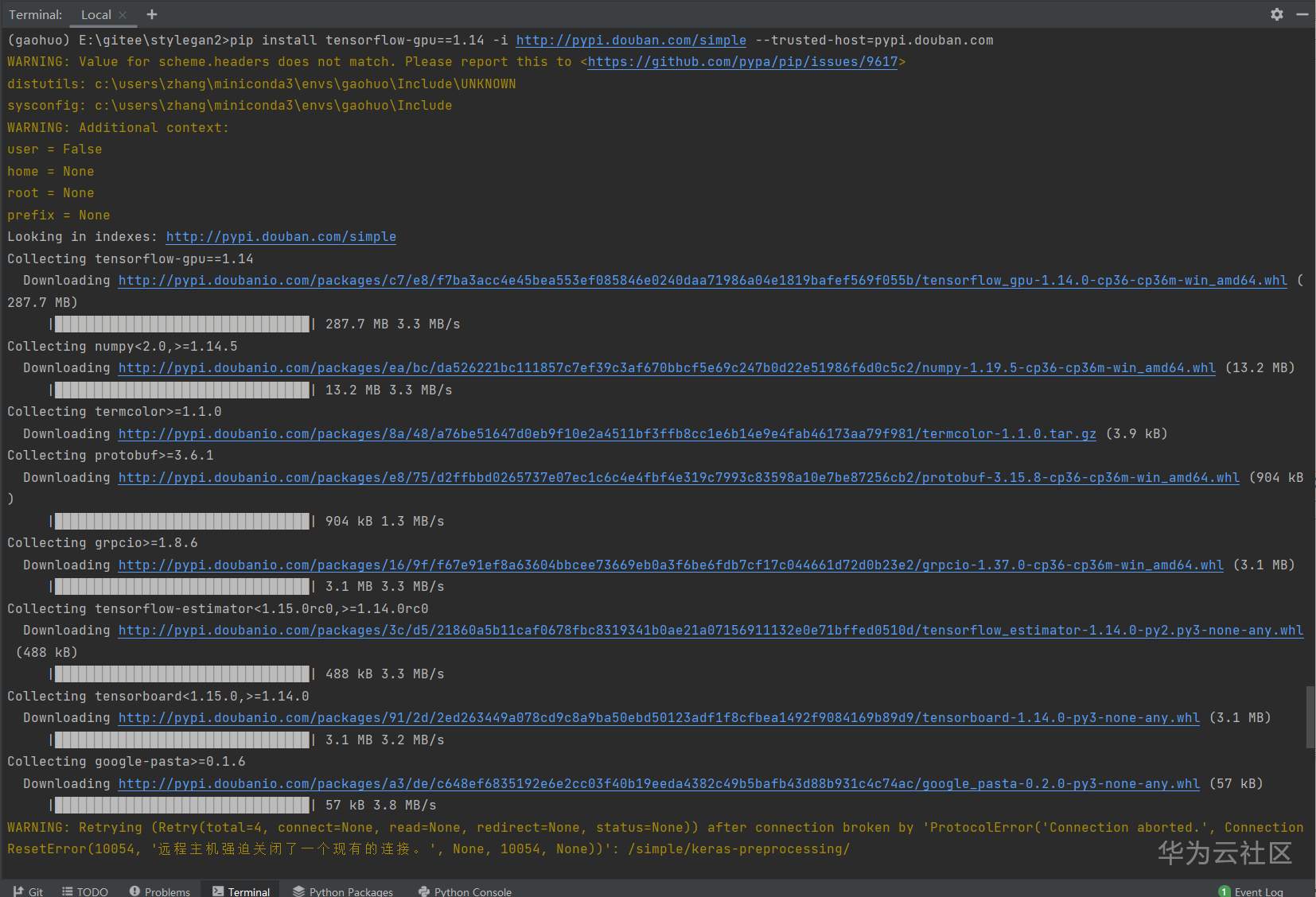 包有点大(287M),耐心等待安装完毕。最近PIP的清华源不大好使,豆瓣源稍微好一点,但是也会断。。有时候安装得靠点运气。