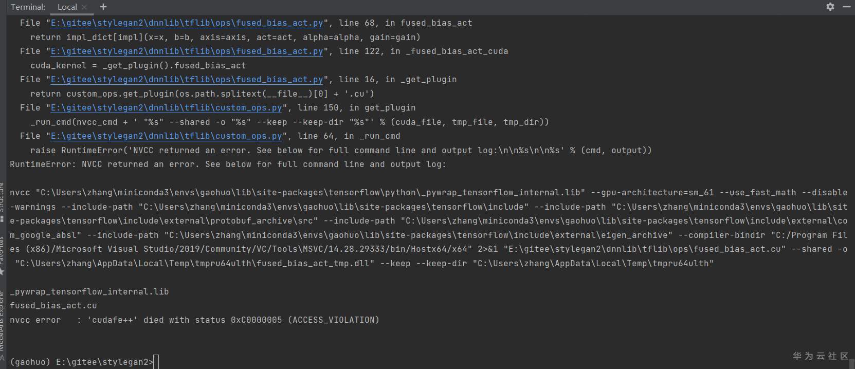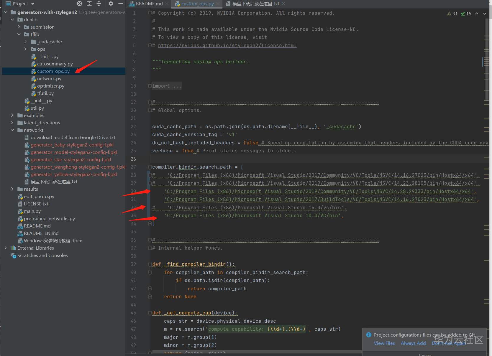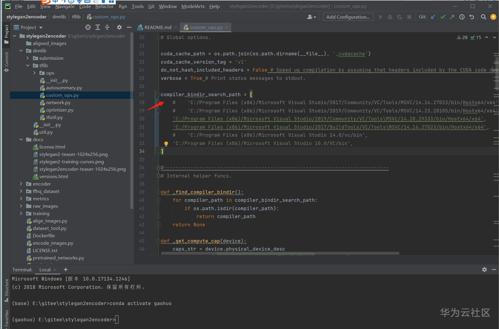 修改 dnnlib/tblib/custom_ops.py文件,将 compiler_bindir_search_path 一节的内容改为跟自己 前面安装的Visual Studio 相同的目录,