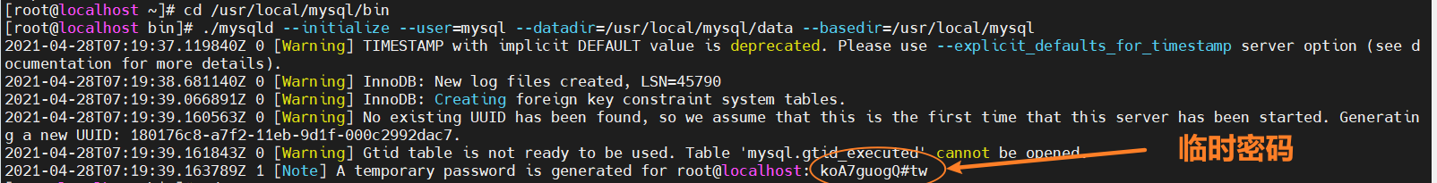 [root@localhost bin]# ./mysqld --initialize --user=mysql --datadir=/usr/local/mysql/data --basedir=/usr/local/mysql