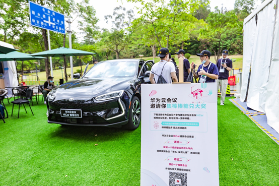 在华为云会议旁边有汽车提供给大家观赏,发布的最新功能均可体验,包括手机和车载大屏无缝衔接,手机和汽车音乐无缝衔接。