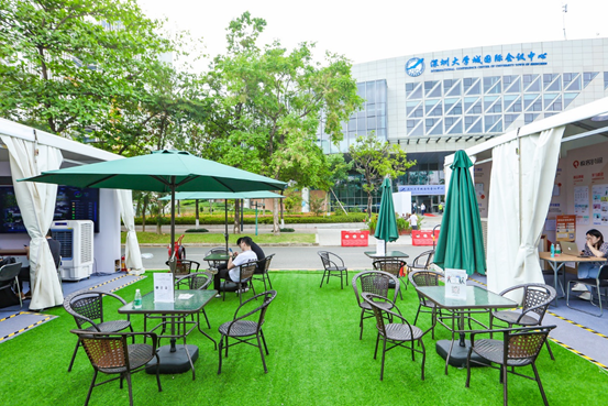 在展区与展区之间呢,都有如下图座位给开发者提供休息和交流的场所,也有饮料和水提供开发者饮用。