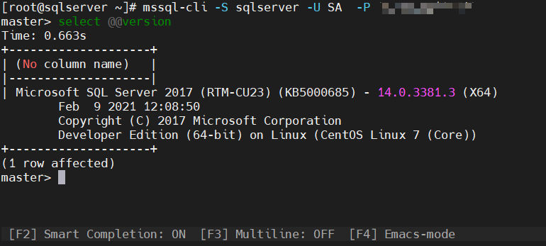[root@localhost ~]# mssql-cli -S 主机名字 -U SA -P '密码'
