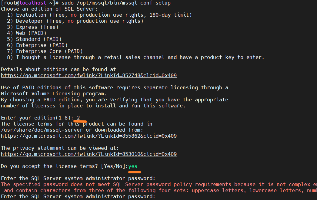 [root@localhost ~]# sudo /opt/mssql/bin/mssql-conf setup