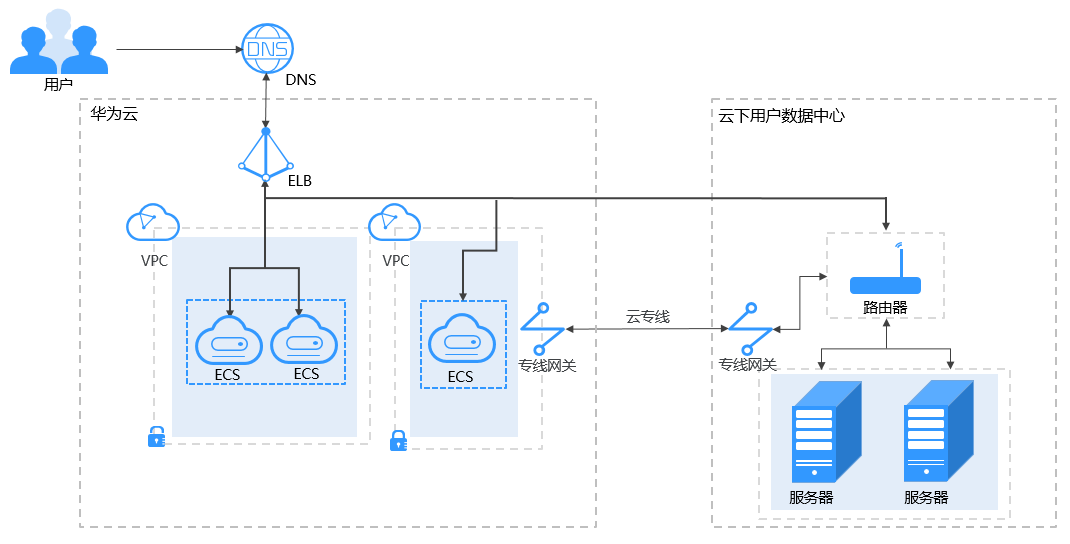 混合负载均衡,即在混合云场景中,云专线或虚拟专用网络将本地基础设施无缝扩展到云上,构建云上云下融合网络,独享型负载均衡后端挂载云上云下的资源,合理实现负载分担。