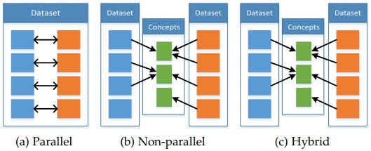 三种co-learning的方法:并行,非并行,混合;第一种方法需要一种模态的observation和另一种模态的observation直接连接,例如在audio-visual speech数据及上,video和speech sample来自同一个speaker;非并行数据方法不需要两种observation的直接连接,通常利用类别间的交集,例如在zero shot learning中利用Wiki的文本数据扩展传统的视觉目标识别数据集提升目标识别的性能;混合数据的方法通过一种共享模态或者数据连接起来
