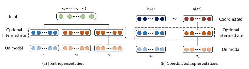 - 两种多模态表征方法:联合表示(joint representation),协同表示(coordinated representation)