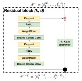 TCN使用一维全卷积结构和 zero padding保证了各隐藏层之间长度与输入长度相同。