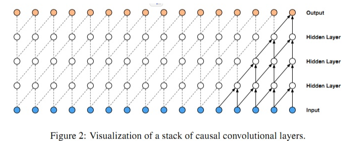 因为要处理时间序列,使用x1,x2,....,xt和y1,y2,....,yt-1来预测yt,因此不能使用普通的CNN。使用因果卷积,不考虑未来的信息,对前一层 t 时刻及之前的状态进行卷积,计算得到 t 时刻的输出,如图2所示。