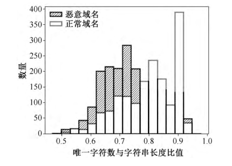 5)唯一字符比例,计算域名中唯一字符数与域名长度的比值,正常域名和恶意域名的唯一字符,比例如图所示