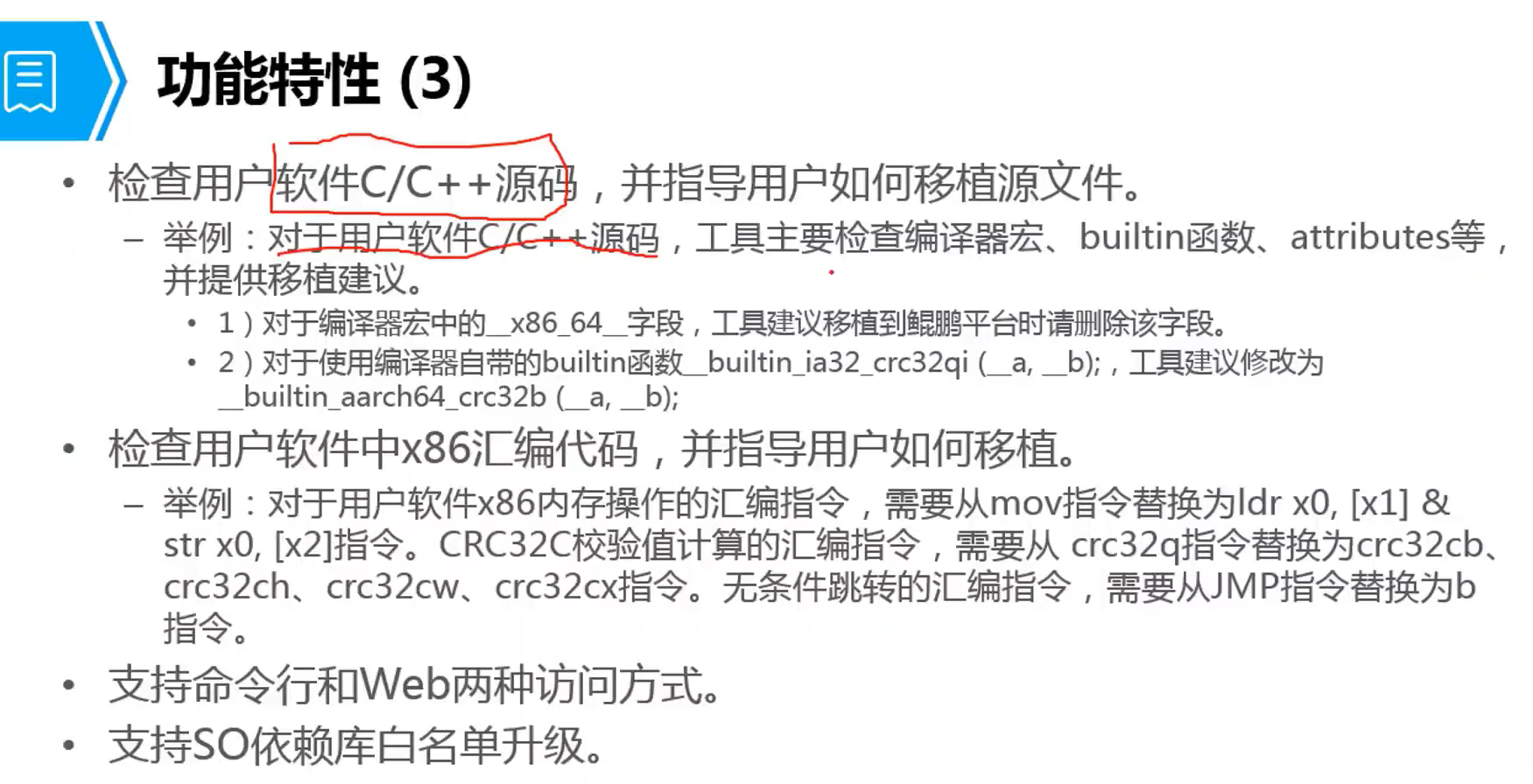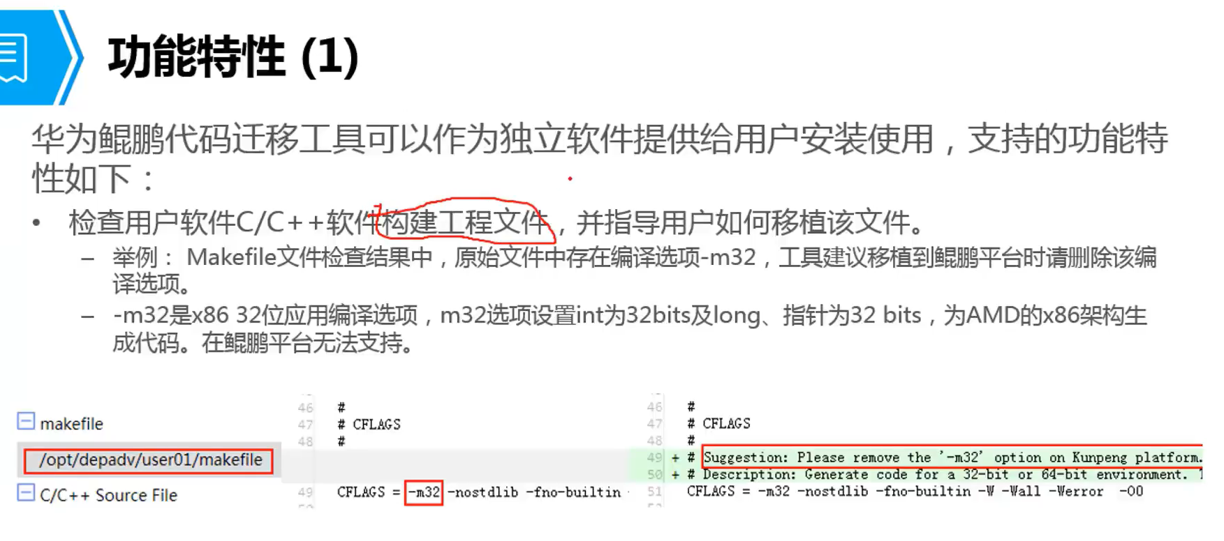 华为鲲鹏代码迁移工具主要面向鲲鹏平台的开发者,用户和第三方待移植软件提供方开发工程师,用来分析待移植软件源码文件,并给出代码移植指导报告,同时能够自动分析出需要修改的代码内容,并指导如何修改,帮助用户顺利完成应用从X86平台向鲲鹏平台的移植
