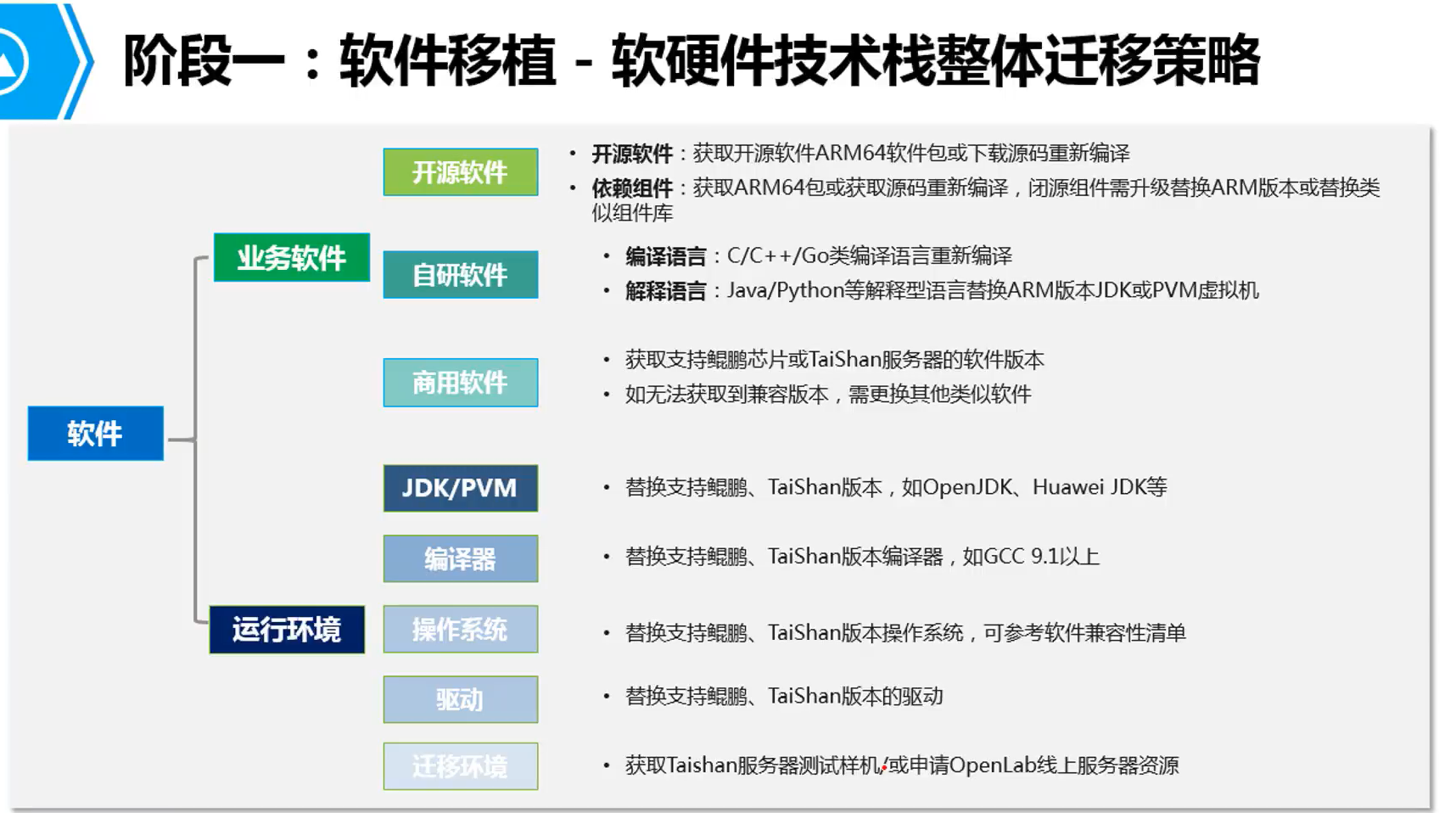 阶段一:技术分析 二:编译迁移 三:功能验证 四:性能调优 五:规模商用