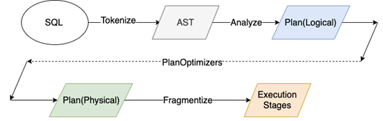 得到最优的执行计划之后,逻辑执行计划被转换成物理执行计划,然后被分片,分割成按照stage执行的一个个子树,最终调度到worker上执行。
