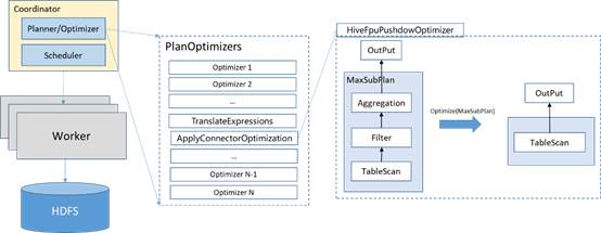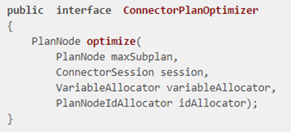 - 首先,引入一些列的下推规则,每一个规则负责下推相应的操作到TableScan操作中,比如PushFilterIntoConnector, PushProjectionIntoConnector, PushAggregationIntoConnector等等;