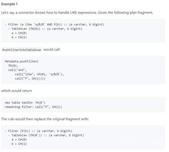 PushFilterIntoConnector会调用Metadata.pushFilter,实际上是调用connector的pushFilter函数,这个函数会返回一个新的tableHandle,新的tableHandle中记录了like表达式的相关信息,同时返回一个remaining filter,即connector不能处理的表达式。最终,PushFilterIntoConnector就把原来的执行计划(上图中第一个框)转换成一个新的执行计划(上图中最后一个框)。
