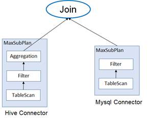 为了防止一个connector的PlanOptimizers修改其他connector的执行计划子树,openLooKeng对于暴露给Connector的PlanNode做了两个限制:(1)暴露出来的PlanNodes须移动到presto-spi模块;(2)仅仅暴露属于connector的子执行计划树给相应的connector。如下图所示,左子树只会暴露给Hive Connector,右子树只会暴露给Mysql Connector。然后会应用他们各自的PlanOptimizers。