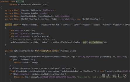 第六:实现XXXQueryGenerator,在XXXQueryGenerator中实现一个visitor用来把下推的信息记录到XXXQueryGeneratorContext,如果存在节点可以下推,则生成对应的sql