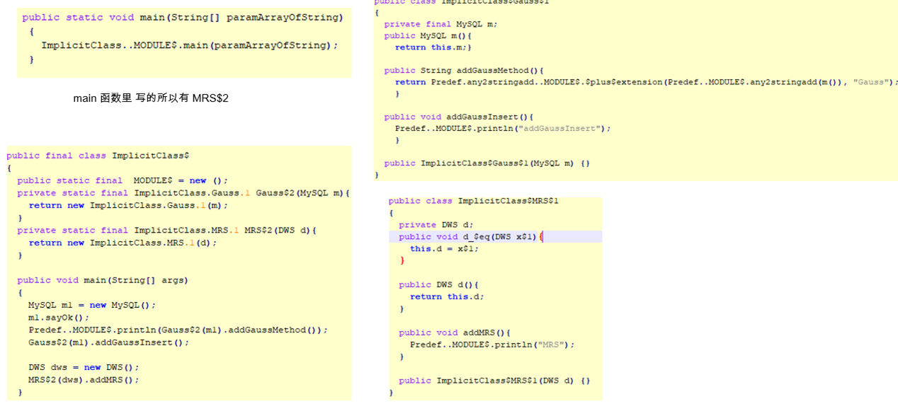 //Gauss 生成隐式类ImplicitClass.MRS.1 MRS$2(DWS d) main 函数内 有个$2 在作用域内 创建DWS实例 编译器就会让隐式类生效