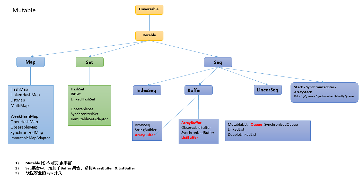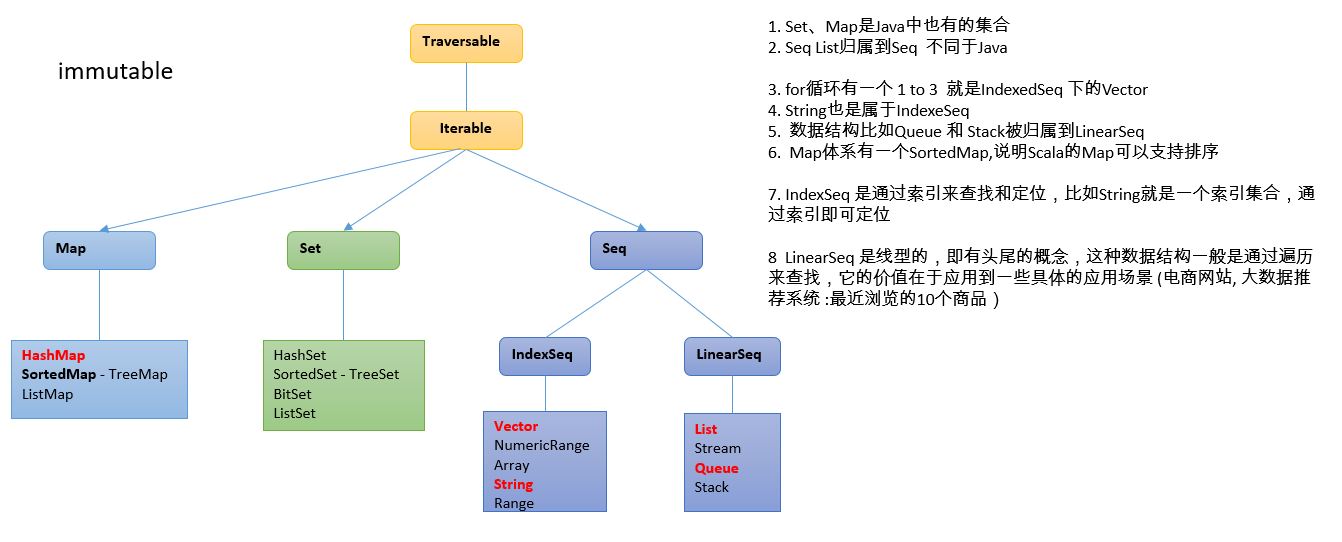 三大类:序列Seq 集Set 映射Map 都扩展自Iterable特质,在Scala中集合有可变(mutable)和不可变(immutable)两种类型