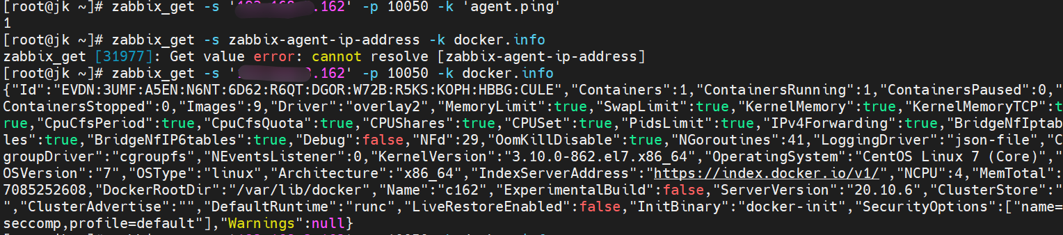 zabbix_get -s 'c162-IP' -p 10050 -k docker.info