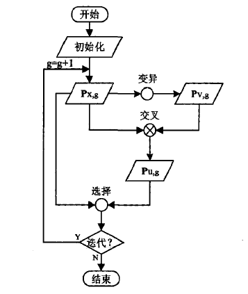 DE采用了和标准进化算法几乎一样的计算步骤:即由父代个体产生子代个体,二者中较好的一个作为新的父代进入下一代进行后续的循环迭代过程。然而又不同于传统的演化算法,DE首先执行变异过程,即在当前种群中随机选择三个个体,将其中两个相减得到差分向量(Difference vector)并叠加在第三个个体,即基个体(Base Vector)上以得到变异个体,再执行交叉操作,即将变异个体与目标个体做交叉得到对应的子代个体,最后执行选择操作,将子代个体与目标个体进行适应值比较,较好的一个进入下一代继续重复迭代过程,直到满足算法的终止条件。