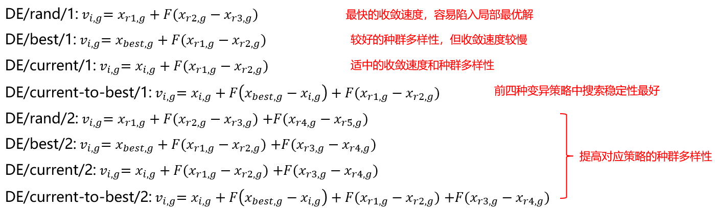 为了简单明了地表示这些不同经典算法版本,DE 的发明者 Price 和 Storm 使用符号“DE/x/yz”来代表不同的 DE 进化策略,即包含变异和交叉的操作过程。其中“DE”表示差分进化算法,“x”表示变异算子中的基向量,“y”表示变异算子中差分向量的个数,“z”表示交叉操作的方法。因为 bin 交叉算子使用得较为广泛, 所以往往不考虑交叉算子的选择,于是“DE/x/y”就被用来表示变异策略。下面列出经典DE算法家族中的变异操作策略及其介绍: