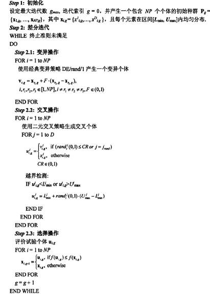 DE算法的选代搜索过程需要三个种群(Population), 每个种群包含NP个个体, 分别称之为当前种群 (Current Population)、变异种群 (Mutation Population ) 和试验种群(Trial Population )。当前种群用 Px,g来表示, 表示由后续迭代过程中的成功个体所构成的种群。变异种群使用Pv,g表示,表示由当前种群中的个体经过变异操作后产生的变异个体组成的中间种群。试验种群用Pu,g表示,表示由当前个体和变异个体进行交叉操作后产生的试验个体组成的子代种群。