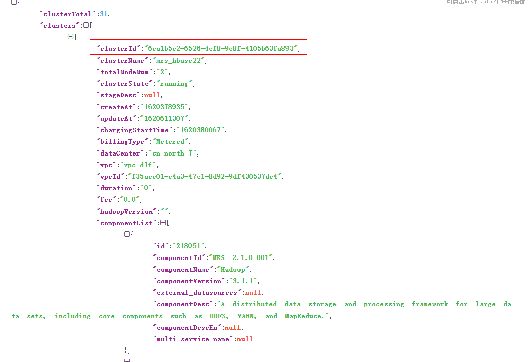 如下图所示,第一个Rest Client调用了MRS服务查询集群列表的API,参照图2,图2中为第一个Rest Client的返回值的JSON消息体,我们要获取返回的集群列表中的第一个集群的cluster Id属性,作为参数传递给第二个Rest Client使用,那么我们可以在第一个Rest Client的“响应消息体解析为传递参数定义”配置中,配置clusterId=clusters[0].clusterId,后续的Rest Client节点就可以用${clusterId}的方式引用到集群列表中的第一个集群的cluster Id。