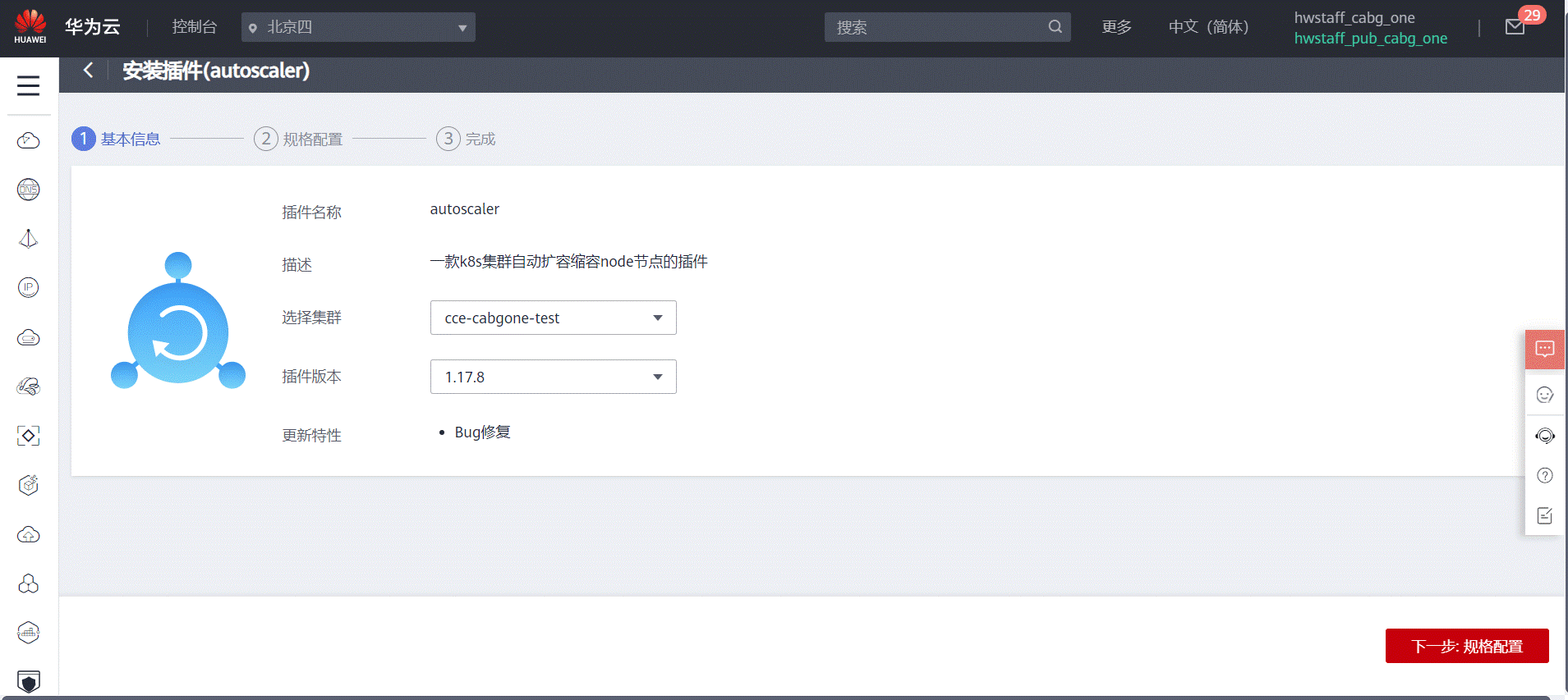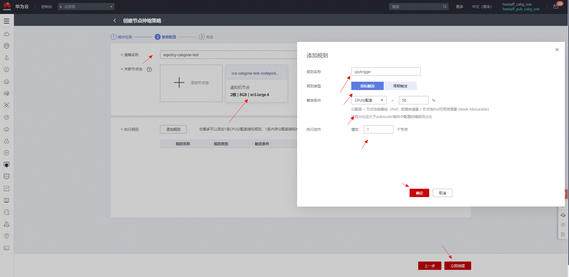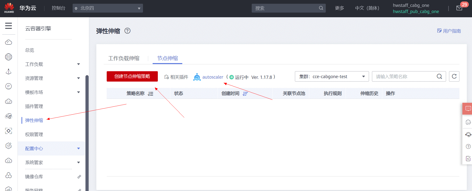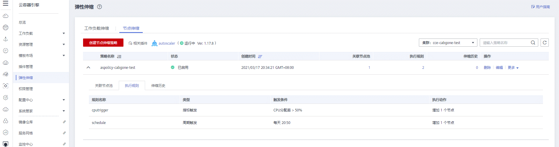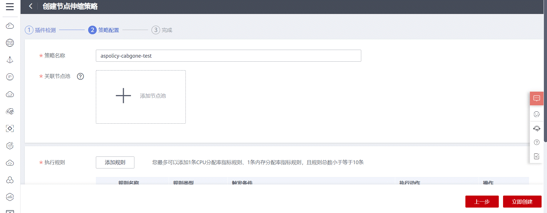 插件安装完以后,就可以到弹性伸缩->节点伸缩中,创建节点伸缩策略,顾名思义。
