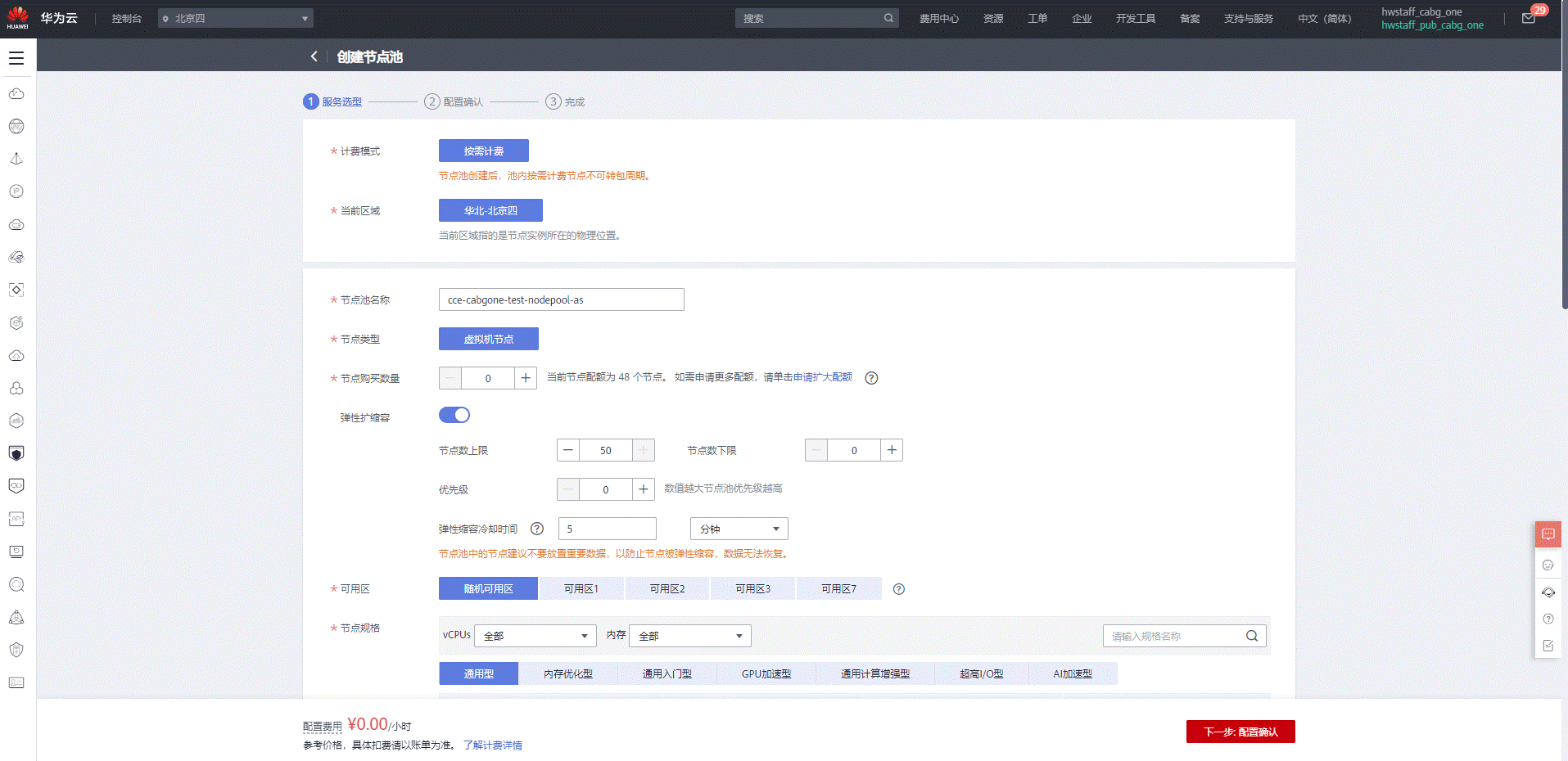 选择0个节点,并启用弹性扩缩容,最大50个节点,最小0个,也就是默认这里没有节点,不伸缩的情况花费是0元。并且选择随机可用区,这样弹性出来的节点会离散分布在不同的AZ里