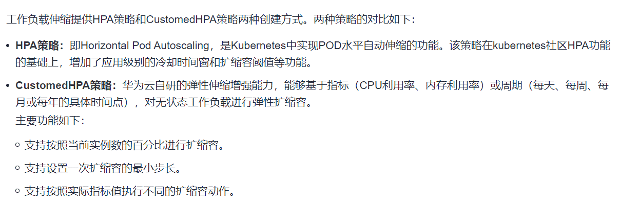 目前CCE的工作负载伸缩功能提供了两种模式,第一种是默认的,也就是K8s配套的,另一种是华为自研的增强版,具体参考官方文档