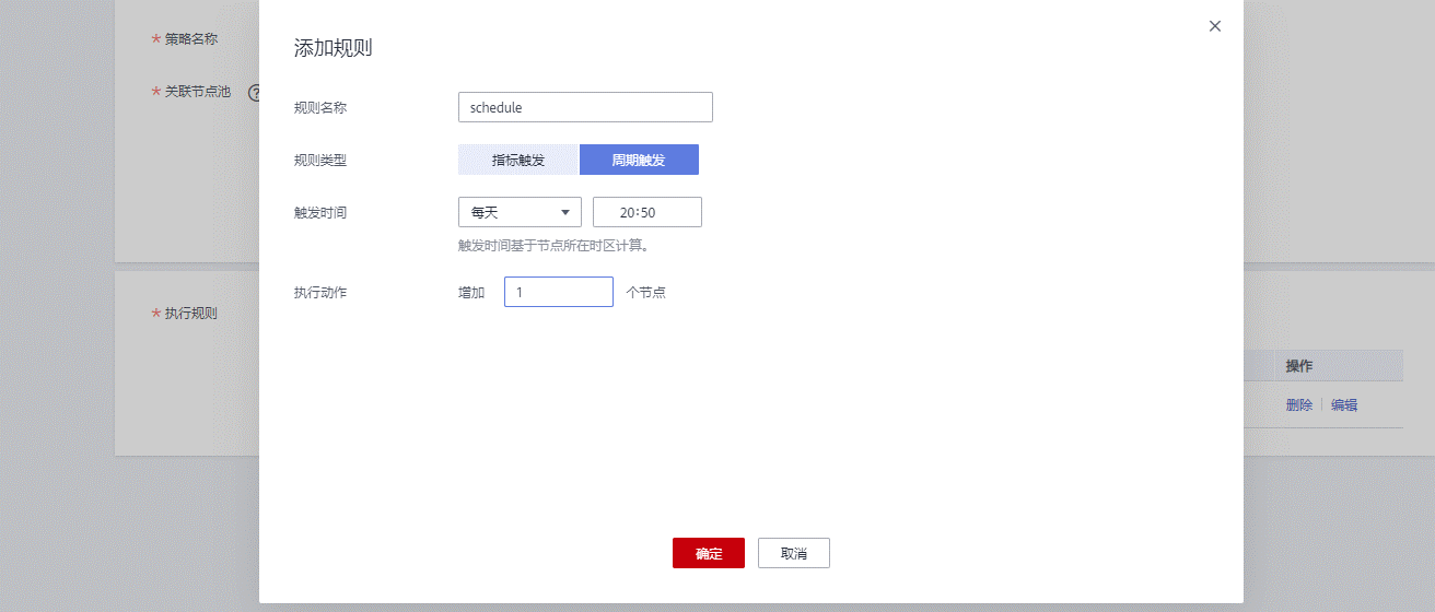 选择刚建好的节点池,然后创建一个规则,这里支持两种,基于CPU/内存,和基于时间,这样可以用来处理突发流量波动和周期性流量波动,比如打卡、促销之类的。