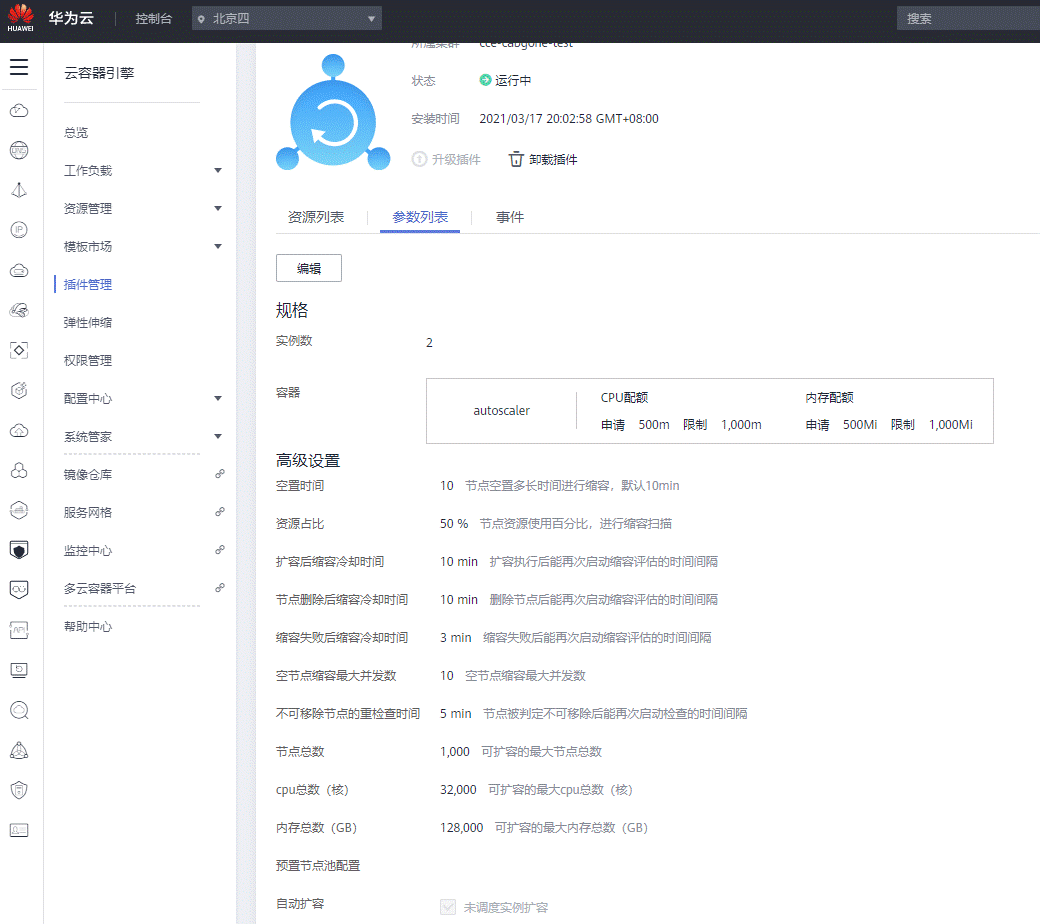 暂时选择50节点的规格,需要2个pod来跑这个插件,并且开启自动缩容,如果资源使用率低于50%的时候,就开始缩容扫描,然后进行安装