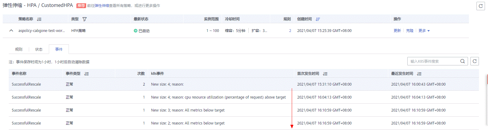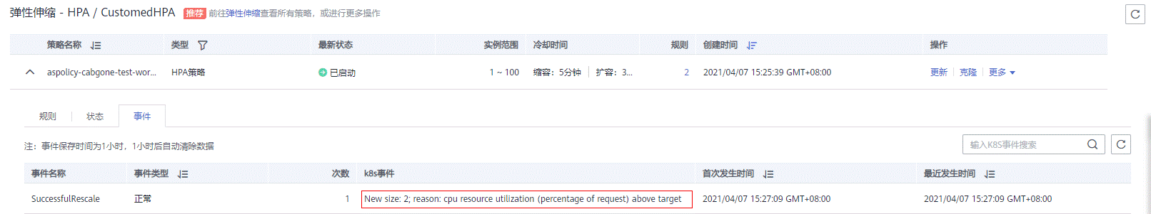 在工作负载的伸缩标签页里,也会看到HPA策略的SuccessfulRescale事件,重新计算了New size: 2; reason: cpu resource utilization (percentage of request) above target