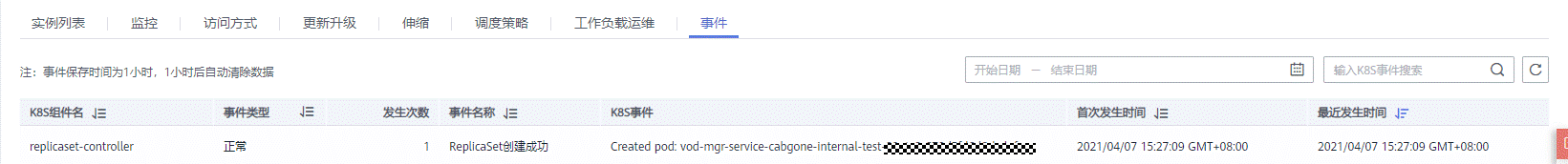 在工作负载的事件标签页里,也会记录一个ReplicaSet创建成功的动作