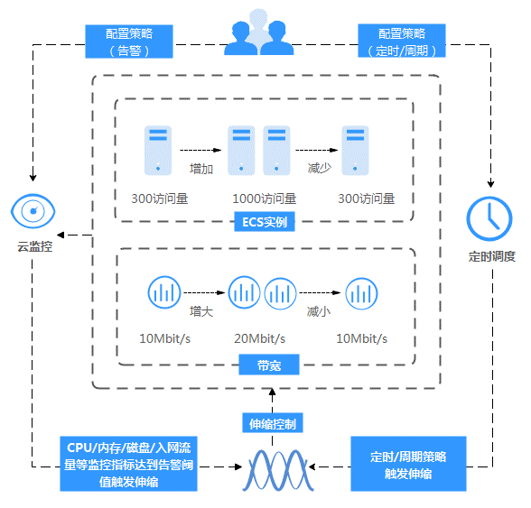 ECS主机实现弹性伸缩,主要靠AS弹性伸缩服务,能监控CPU、内存、磁盘、入网流量等指标,然后自动的弹性伸缩,整体机制和前面节点伸缩差不多。