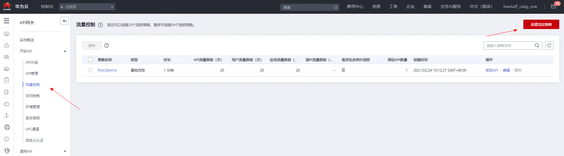 API网关针对所有已发布的API,提供了一种流控措施,可以通过创建API流控策略,绑定API,进行生效。