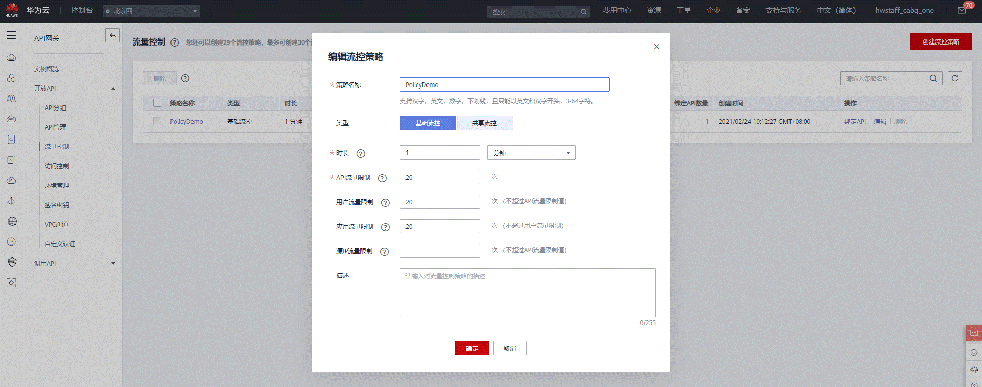 APIG服务中,进入流量控制页面,创建新的流控策略