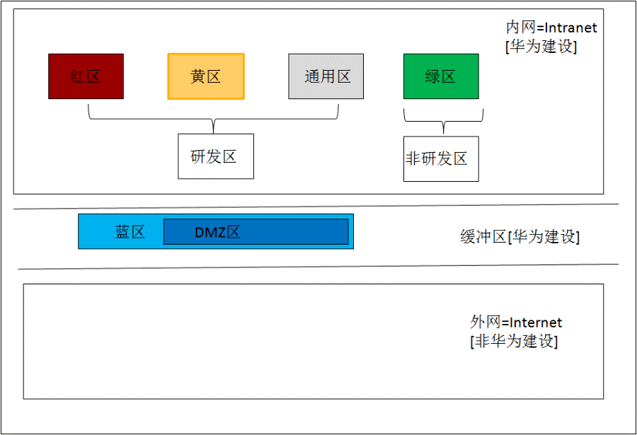 按照公司的做法,网络分区一般分为红黄绿蓝四个区,外加DMZ、E区,再加上研发、非研发、服务器侧、用户侧、测试、生产等维度,就显得有点错综复杂了。