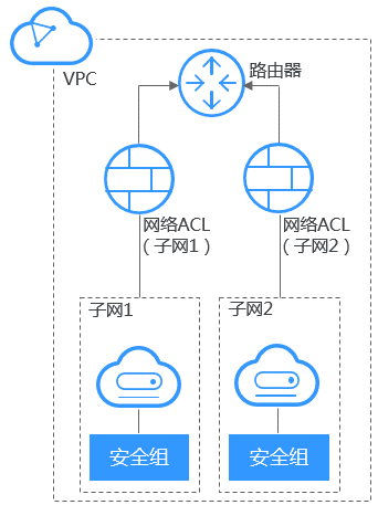 通过安全组,配合ACL,进行安全防火,限制请求的出入。安全组对弹性云服务器进行防护,网络ACL对子网进行防护