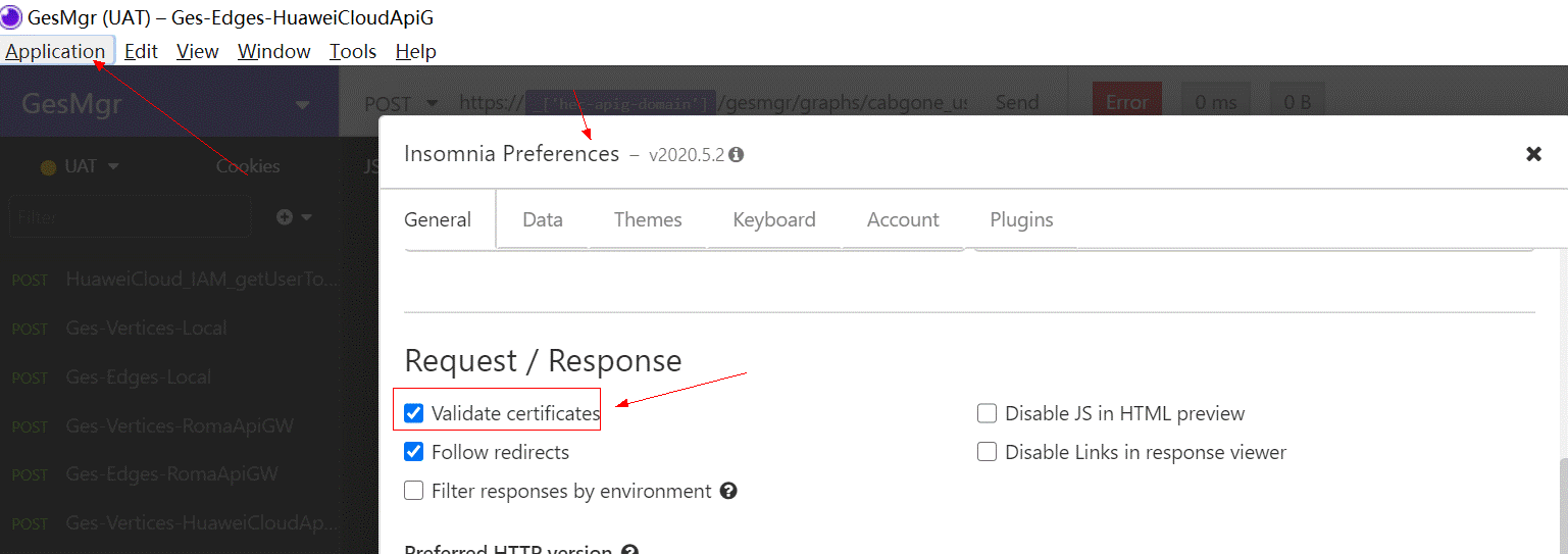 - 通过Insomnia(一个类似PostMan的工具)进行验证。验证之前,确保我开启了Validate certificates