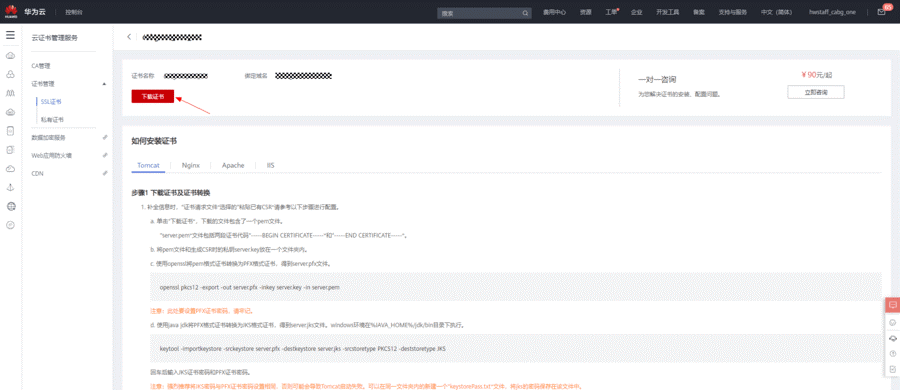 - 登录华为云后,进入云证书管理(CCM)服务,选择证书管理->SSL证书,点击购买证书