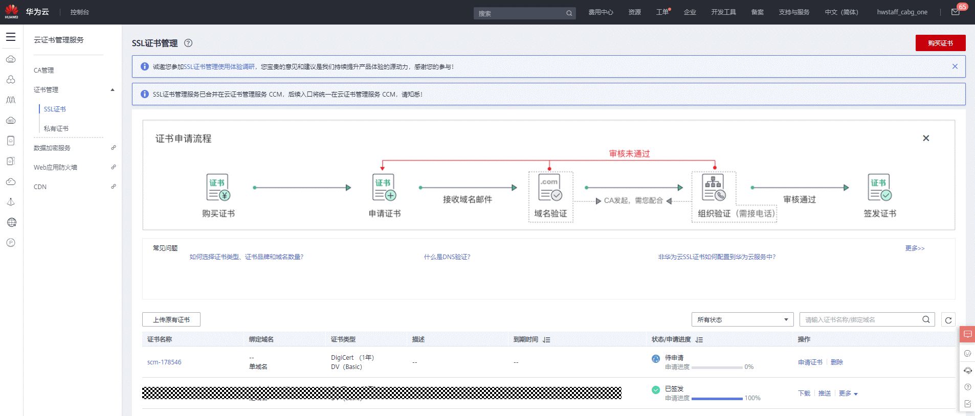 - 购买成功后,会在CCM控制台看到一个待申请的证书,点击申请证书。