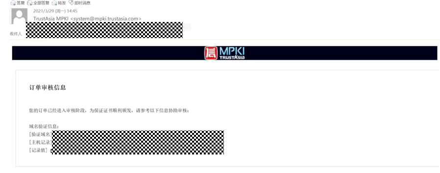 - 首先证书颁发机构,会给我们前面登记的技术人员联系邮箱,发送一封邮件。