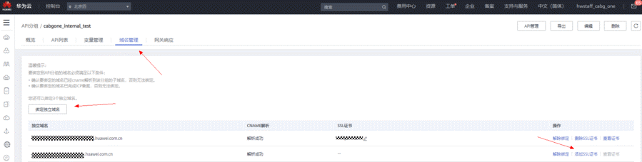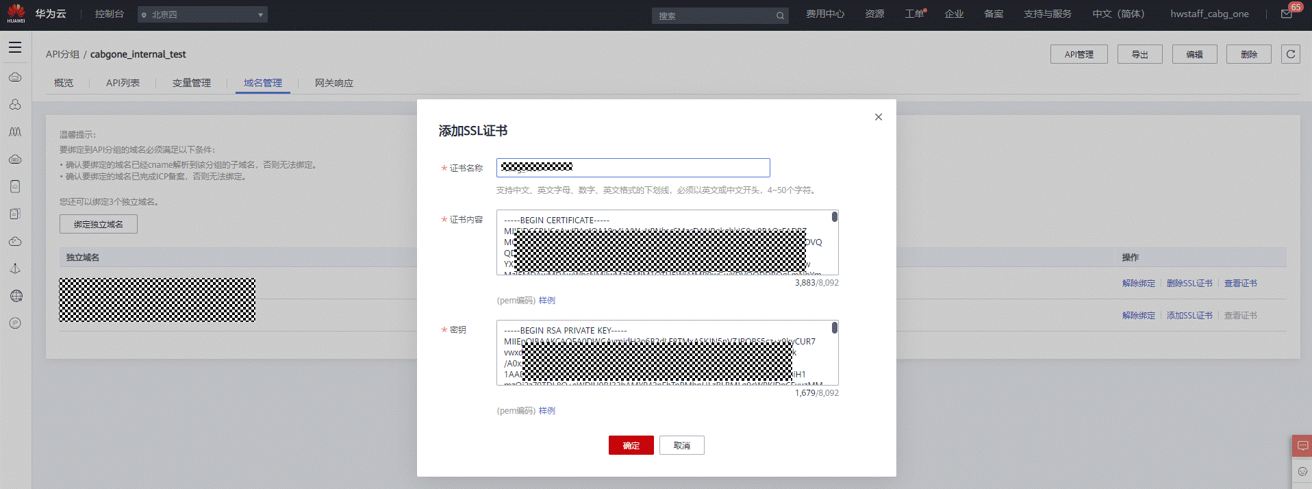 - 回到前面的API分组->域名管理页面,点击添加SSL证书,填入前面下载的证书内容,即可完成绑定