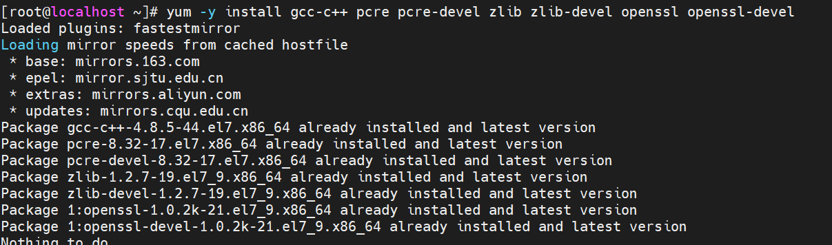 yum -y install gcc-c++ pcre pcre-devel zlib zlib-devel openssl openssl-devel