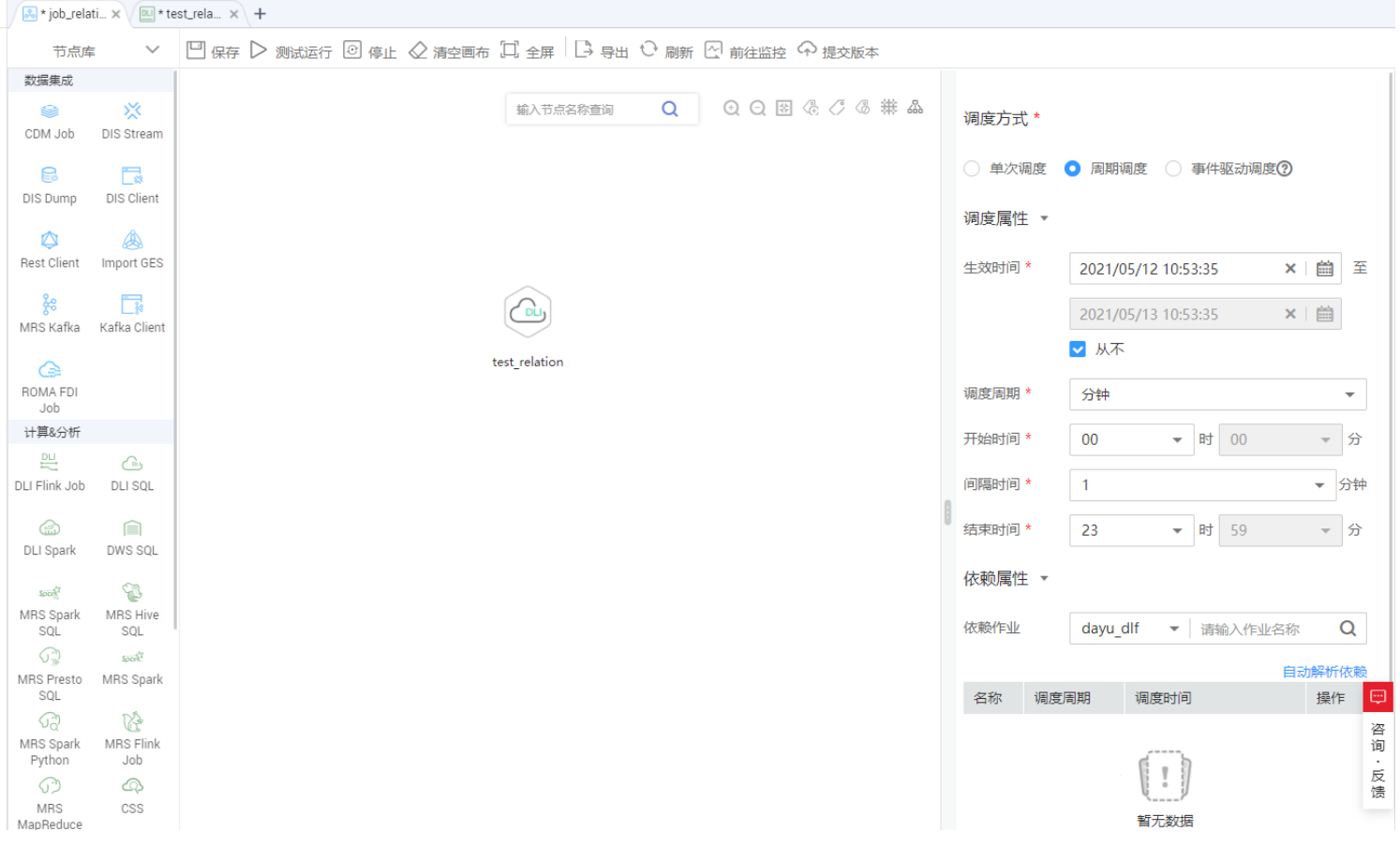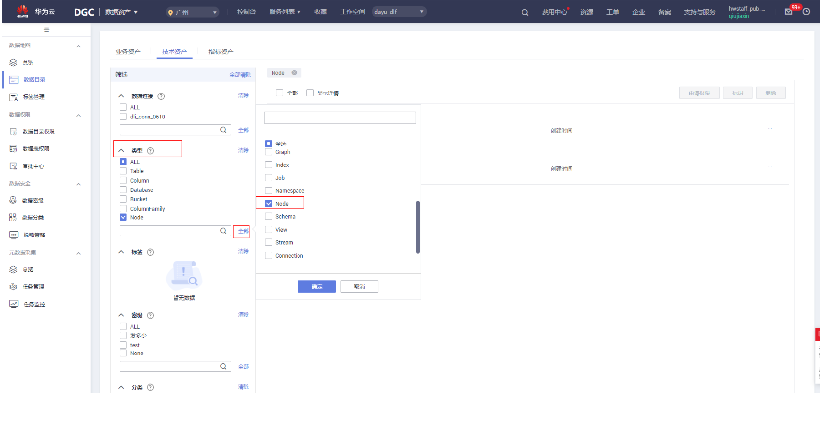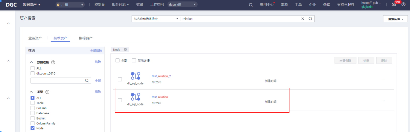 11、前往数据资产,选择Node类型,Node对应数据开发作业中DLI SQL节点的名称,这里的节点名称是test_relation。