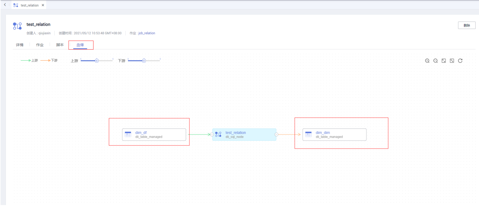 12、点击test_relation,查看血缘关系,可以看到DGC自动根据DLI SQL语句解析出了表dim_df和dim_dim之间产生了血缘关系。从下图中可以看出上游是dim_df,下游是dim_dim,两张表之间通过test_relation这个Node产生了血缘关系。