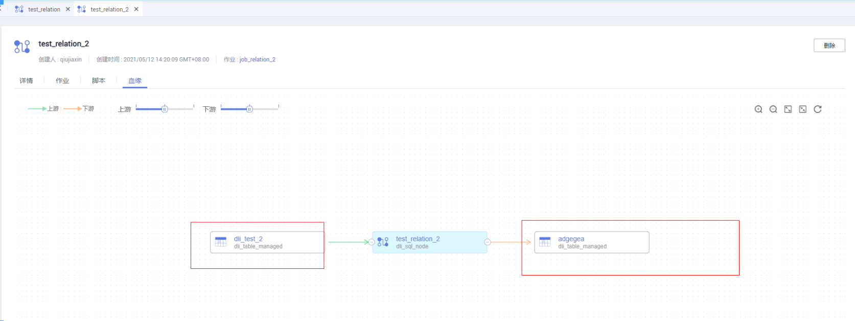 14、比如还是关联同一个DLI SQL脚本,SQL语句还是 INSERT INTO dim_dim SELECT ddddf FROM dim_df,但是我们手动给test_relation_2节点配置了上图中的血缘关系,上游输入是表dli_test_2,下游输出表是adgegea。点击执行调度之后,再前往数据资产查看test_relation_2这个Node的血缘关系:可以看到此时并没有以SQL语句里面的关系为准,而是以用户手动配置的血缘关系为准进行血缘关系展示。