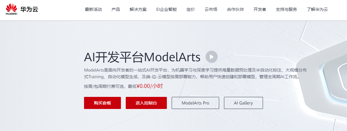 打开华为云 ModelArts 主页:https://www.huaweicloud.cn/product/modelarts.html,点击“进入控制台”。
